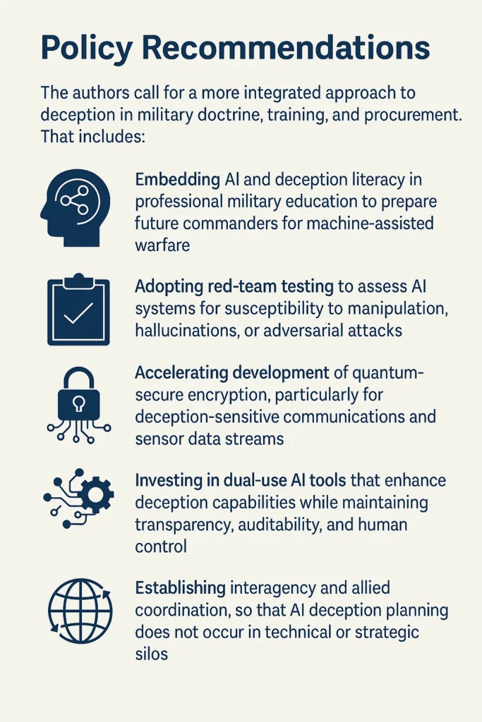 To close that gap, the authors argue that democratic militaries must update their approach to technology-driven deception. That means integrating AI literacy into officer training, adapting acquisition systems to support rapid iteration, and building safeguards that recognize the limits of machine judgment.
