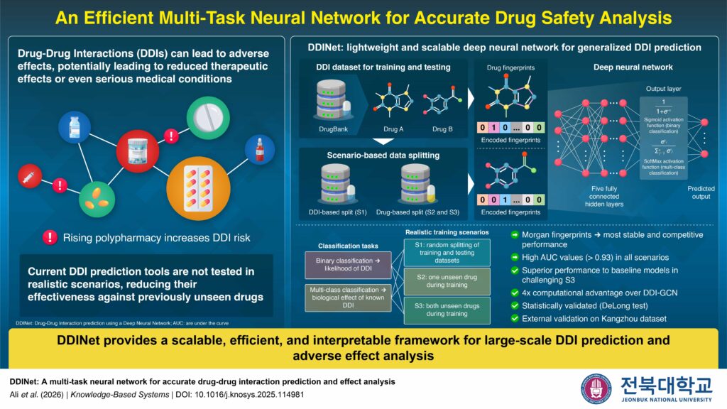 - Researchers at Jeonbuk National University developed DDINet, a lightweight deep-learning model that predicts drug–drug interactions and their biological effects while using less computational power than many existing approaches.
